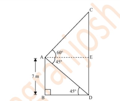 Q. From the top of a 7 m high building, the angle of elevation of the top of a cable tower is 60° and the angle of depression of its foot is 45°. Determine the height of the tower.