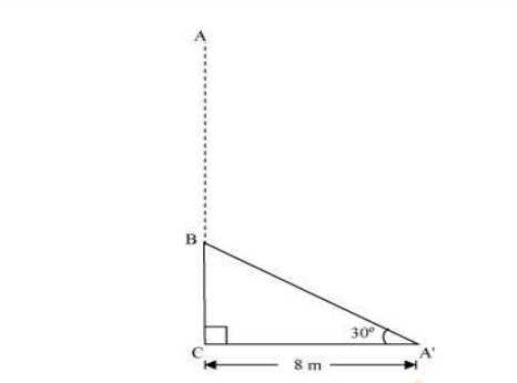 Let AC was the original tree. Due to storm, it was broken into two parts. The broken part A’B is making 30° with the ground.
