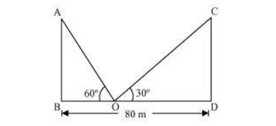 Q. Two poles of equal heights are standing opposite each other on either side of the road, which is 80 m wide. From a point between them on the road, the angles of elevation of the top of the poles are 60° and 30°, respectively. Find the height of the poles and the distances of the point from the poles.