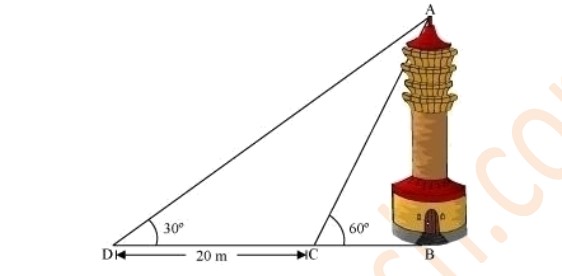 Q. A TV tower stands vertically on a bank of a canal. From a point on the other bank directly opposite the tower, the angle of elevation of the top of the tower is 60°. From another point 20 m away from this point on the line joining this point to the foot of the tower, the angle of elevation of the top of the tower is 30°. Find the height of the tower and the width of the canal.