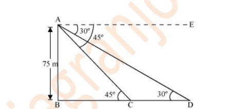 Q. As observed from the top of a 75 m high lighthouse from the sea-level, the angles of depression of two ships are 30° and 45°. If one ship is exactly behind the other on the same side of the lighthouse, find the distance between the two ships.