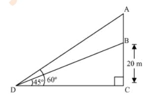 Q. From a point on the ground, the angles of elevation of the bottom and the top of a transmission tower fixed at the top of a 20 m high building are 45° and 60° respectively. Find the height of the tower.