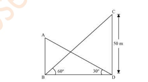 Q. The angle of elevation of the top of a building from the foot of the tower is 30° and the angle of elevation of the top of the tower from the foot of the building is 60°. If the tower is 50 m high, find the height of the building.