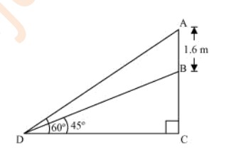 Q. A statue, 1.6 m tall, stands on the top of a pedestal. From a point on the ground, the angle of elevation of the top of the statue is 60° and from the same point the angle of elevation of the top of the pedestal is 45°. Find the height of the pedestal.