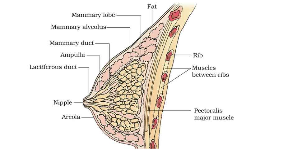 - The glandular tissue of each breast is divided into 15-20 mammary lobes containing clusters of cells called alveoli.