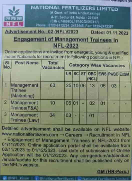 NFL Recruitment 2023: National Fertilizers Limited (NFL) has released a notification for the post of Management Trainee in the Employment News (18-24) November 2023 . A total of 74 vacancies will be filled through said posts. The online registration will start on 02 November and the last date of application is 01 December 2023.