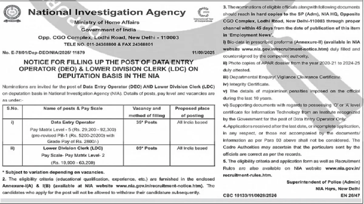 NIA Recruitment 2025 notification is available to fill a total of 40 positions including Data Entry Operator (DEO) and Lower Division Clerk (LDC) posts across the country. An overview of the recruitment process is provided below for the candidates.