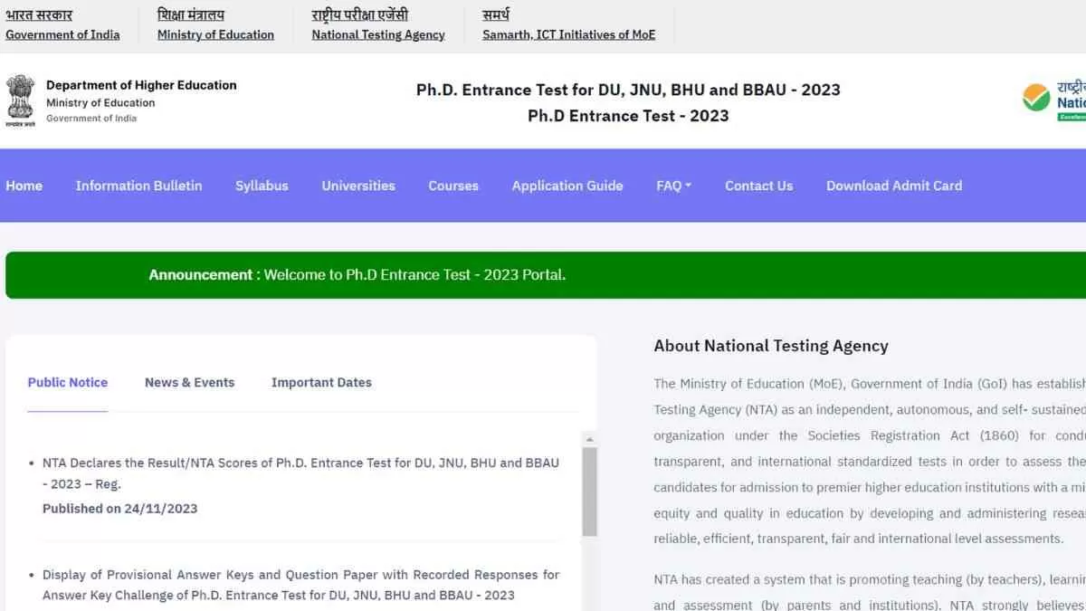 NTA PhD Result 2023: राष्ट्रीय परीक्षण एजेंसी (एनटीए) द्वारा DU, JNU, BHU और BBAU पीएचडी प्रवेश परीक्षा के परिणाम घोषित कर दिए गए हैं। एनटीए ने दिल्ली विश्वविद्यालय (डीयू), जवाहरलाल नेहरू विश्वविद्यालय (जेएनयू), बनारस हिंदू विश्वविद्यालय (बीएचयू) और बाबासाहेब भीमराव अंबेडकर विश्वविद्यालय (बीबीएयू) में पीएचडी पाठ्यक्रमों में प्रवेश के लिए प्रवेश परीक्षा की अनंतिम उत्तर कुंजी 8 नवंबर को जारी की थी और अब 24 नवम्बर को एनटीए पीएचडी प्रवेश परीक्षा का परिणाम जारी कर दिया हैI ये परिणाम एनटीए की ऑफिसियल वेबसाइट phd-entrance.samarth.ac.in पर जारी किया जाएगाI