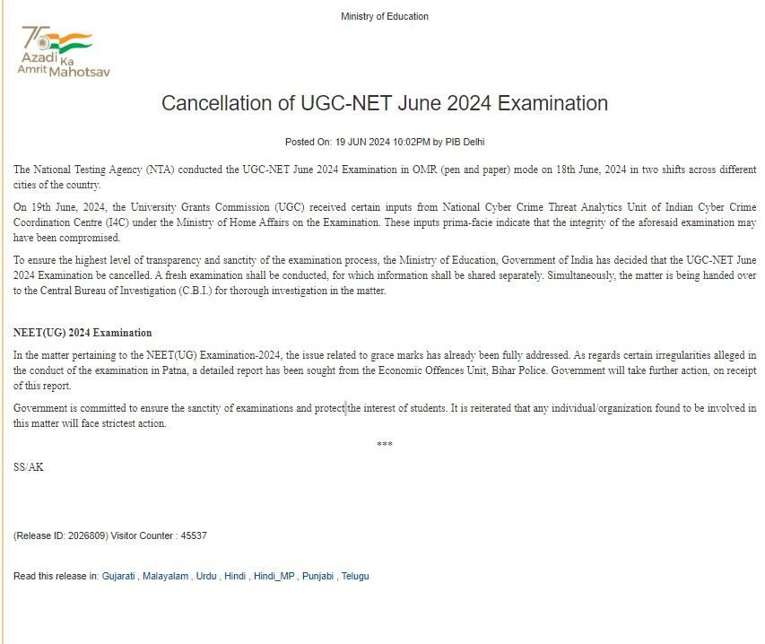 The Ministry of Education took to its social media platform X and posted, “Government is committed to ensure the sanctity of examinations and protect the interest of students. Ministry of Education has decided that the UGC-NET June 2024 Examination be cancelled on the basis of inputs from the Indian Cyber Crime Coordination Centre (I4C) under the Ministry of Home Affairs, prima facie indicating that the integrity of the examination may have been compromised.”