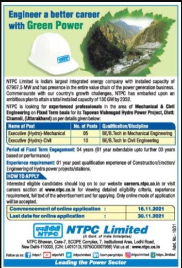 पात्र और इच्छुक उम्मीदवार 16 नवंबर से 30 नवंबर 2021 तक careers.ntpc.co.in पर ऑनलाइन आवेदन कर सकते हैं.