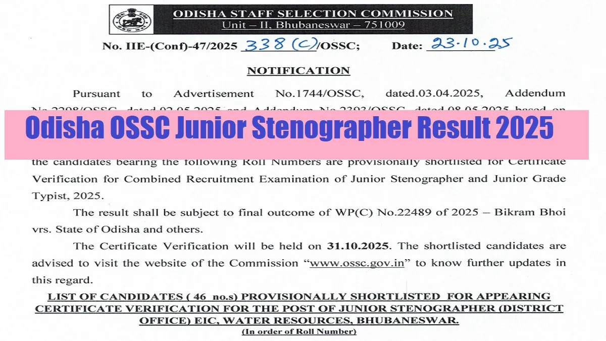 Odisha OSSC Junior Stenographer Result 2025: The Odisha Staff Selection Commission (OSSC) has released the result for the Combined Recruitment Examination for Junior stenographer -2025 on its official website. Candidates qualified for Stenographer posts will have to appear for next Document Verification round. The Commission has uploaded the detailed list of shortlisted candidates for document verification round which is scheduled to be held on October 31, 2025.