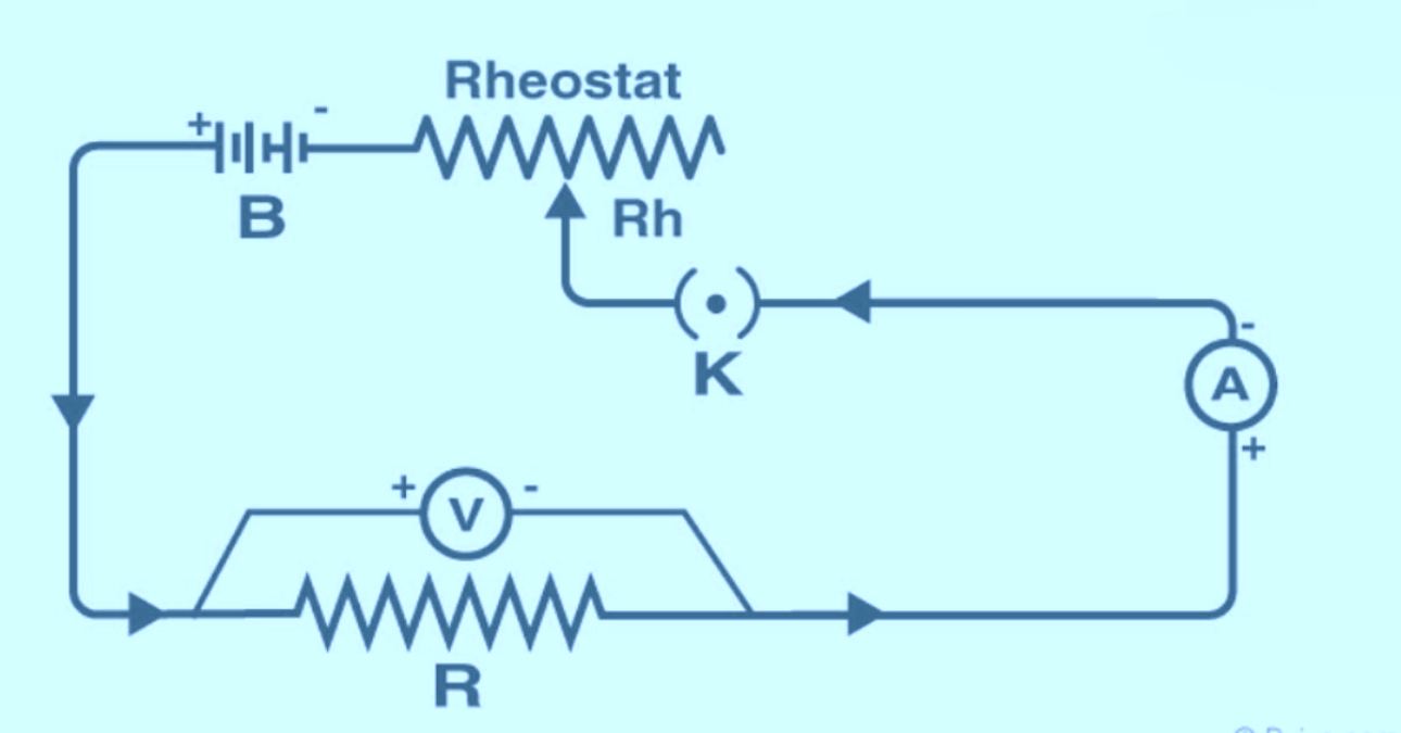 - At the start, key K is closed and the rheostat is adjusted to get the minimum reading in the ammeter A and voltmeter V.