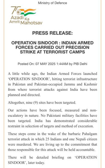 The Ministry of Defence has released an official press release informing that the Indian Army had carried out a successful strike at terrorist infrastructure in Pakistan and PoK and called it Operation Sindoor.