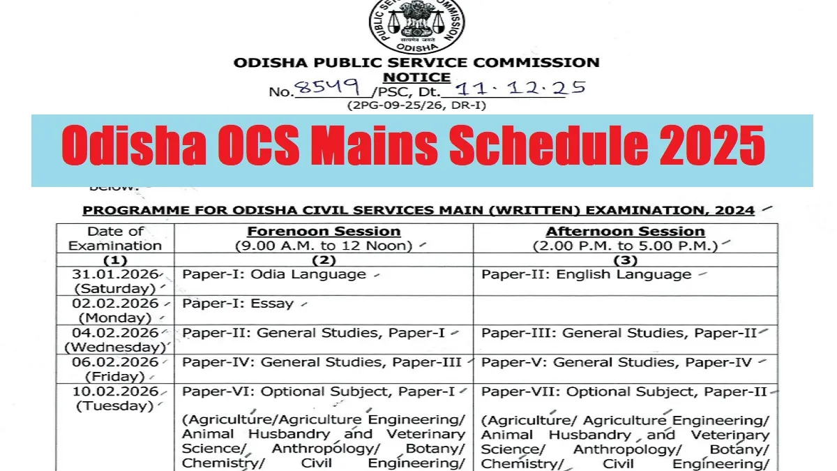 Odisha OCS Mains Schedule 2025: Odisha Public Service Commission (OPSC) has released the Odisha Civil Services Mains Examination Schedule on its official website -www.opsc.gov.in. The Odisha Civil Services Main Mains Examination will be conducted from January 31 to February 10, 2026.The Odia Language paper and English language paper will be held on January 31, whereas General Studies and optional papers will be held from February 02, 2026 onwards.