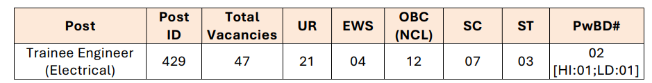 उम्मीदवार के पास मान्यता प्राप्त विश्वविद्यालय या शिक्षा संस्थान से इलेक्ट्रिकल विषय में पूर्णकालिक बीई/बीटेक/बीएससी (इंजीनियरिंग) या समकक्ष डिग्री होनी चाहिए, जिसमें न्यूनतम 60% अंक या समकक्ष CGPA हो। शैक्षणिक योग्यता के बारे में अधिक जानकारी के लिए अधिसूचना पीडीएफ देखें।