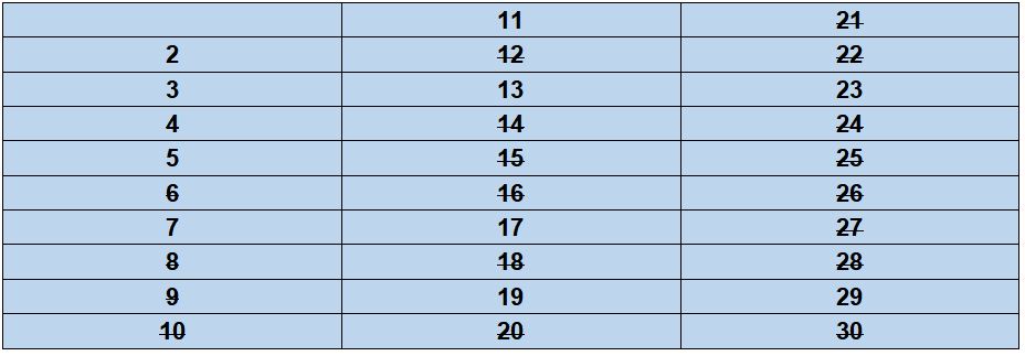 Step 2: Next unmarked number is 3, mark all multiples of 3, i.e., 6, 9, 12, ..., 30.