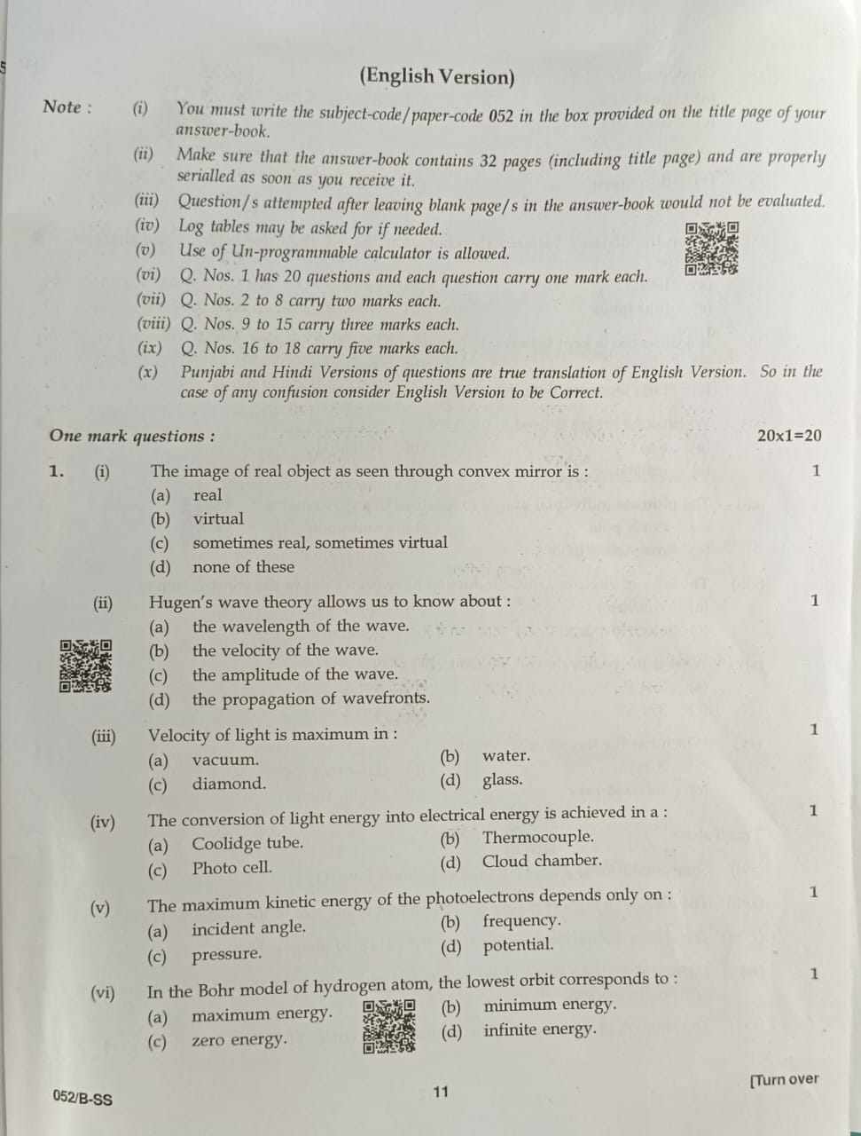 Punjab Board Class 12 Physics Question Paper 2025 Download PDF