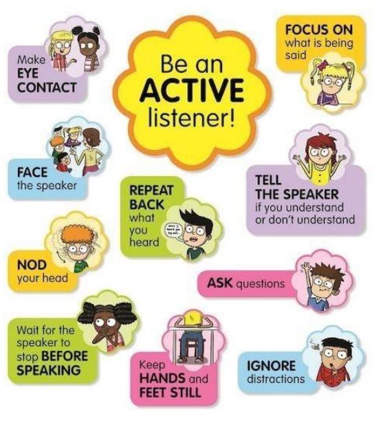 | a) Good Manners b) Active Listener c)Active Speaker d)Discipline |
