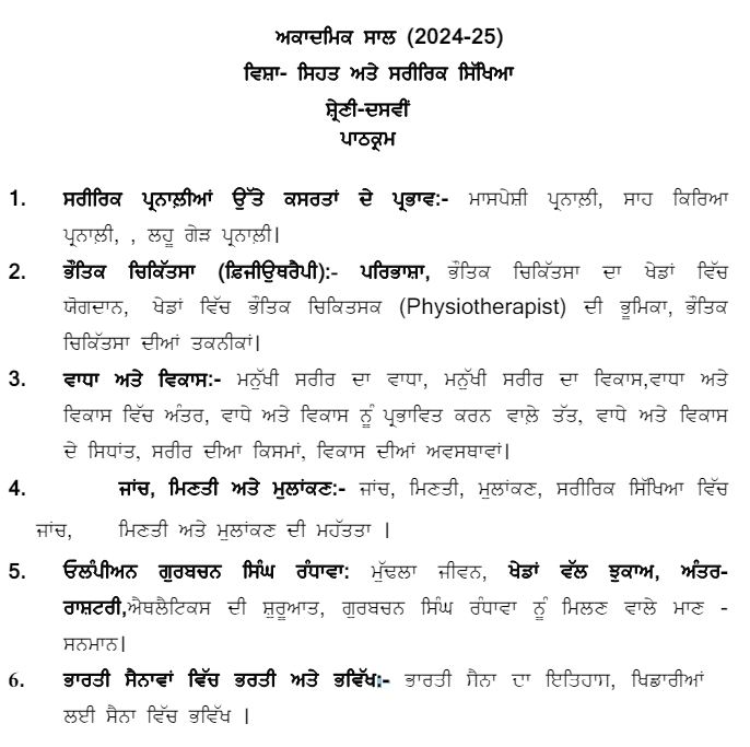 PSEB 10th Health and Physical Education Syllabus 2024-25