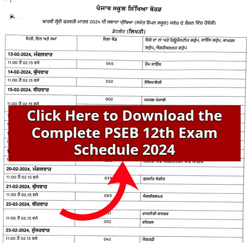 The Punjab School Education Board has released the 2024 exam schedule for Class 12. The exams will be conducted from February 13, 2024 till March 30, 2024. Download the Complete PDF from below: