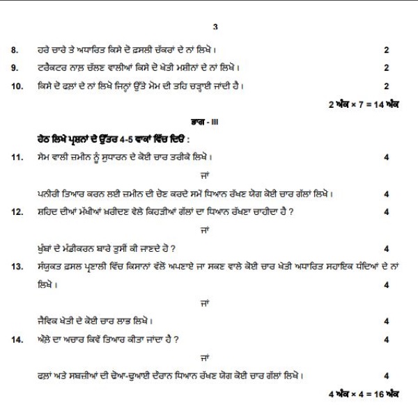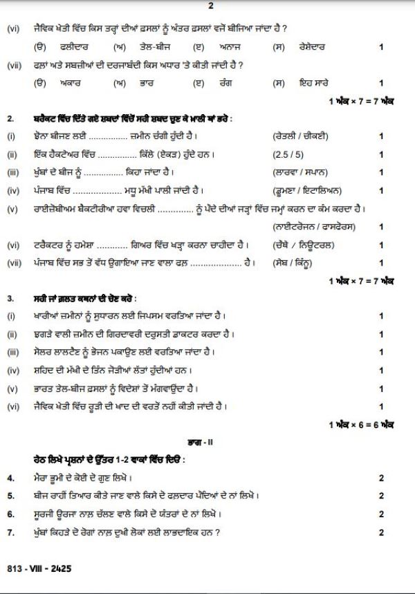 PSEB Punjab Board Class 8th Agriculture Sample Paper 2024-25