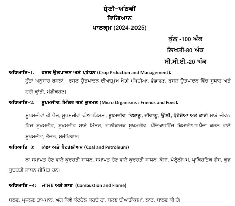 Punjab Board Class 8 Science Syllabus 2025: Science is an important subject and is always kept as a core subject in all mid- and senior-level classes until secondary education. The reason behind this is to provide basic knowledge of phenomena and concepts occurring around living beings. PSEB Class 8 students. The latest syllabus for Punjab Board Class 8 Science for the 2024–25 academic year is provided here. This course will take the students on a new journey of knowing the motion and structure of living beings and chemical reactions. To check and download the syllabus PDF, read this article. The free PDF link is provided here.
