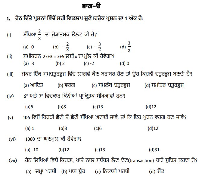 Scroll down and check the latest Punjab Board Maths sample paper for Class 8 and solve the questions. To get a better view, download it as a as a free PDF through the link attached at the end.