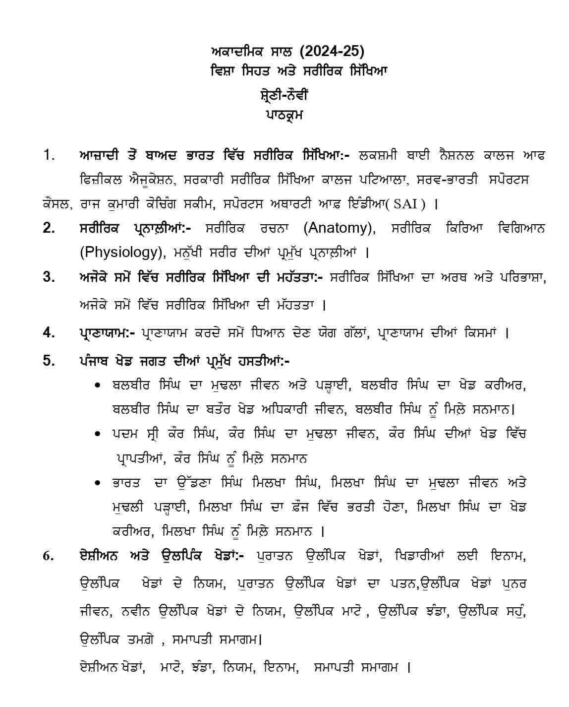 Punjab Board Class 9 Health & Physical Education Syllabus 2024-25