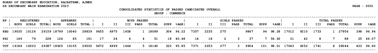 राजस्थान बोर्ड 12वीं रिजल्ट 2023 कॉमर्स स्ट्रीम में ओवर ऑल पास परसेंटेज 96.60 रहा. लड़कों का पास परसेंटेज 95.85 और लड़कियों का पास परसेंटेज 98.01% रहा है.