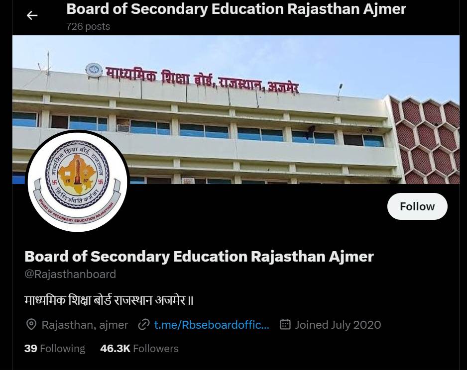 | Update: 28 May| 10:10 AM RBSE twitter: आधिकारिक सोशल मीडिया ट्विटर अकाउंट कौन सा है?राजस्थान बोर्ड ऑफ सेकेंडरी एजुकेशन (RBSE) का आधिकारिक ट्विटर हैंडल @rajasthanboard है। इस हैंडल पर राजस्थान बोर्ड द्वारा विभिन्न परीक्षाओं, नतीजों, महत्वपूर्ण तिथियों और अन्य जानकारियों को साझा किया जाता है। यह छात्रों और अभिभावकों को बोर्ड संबंधित अपडेट प्राप्त करने के लिए एक आधिकारिक और विश्वसनीय स्रोत है। राजस्थान बोर्ड के आधिकारिक ट्विटर हैंडल @rajasthanboard पर सामग्री राजस्थानी और अंग्रेजी दोनों भाषाओं में पोस्ट की जाती है ताकि अधिकाधिक लोग उसे समझ सकें। यदि आपको किसी भी प्रकार की जानकारी चाहिए तो आप इस हैंडल को फॉलो कर सकते हैं।