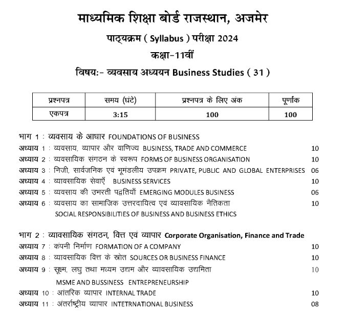 Download RBSE Class 11 Business Studies Syllabus 2024-25 PDF