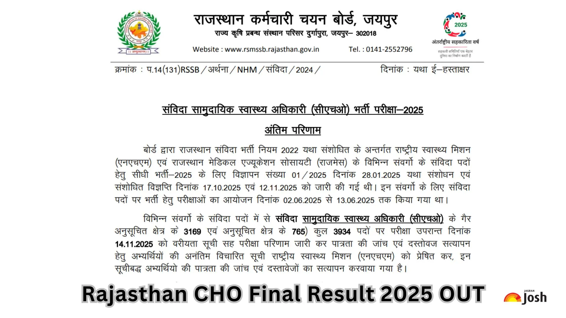 Rajasthan CHO Final Result 2025 OUT: राजस्थान स्टाफ सिलेक्शन बोर्ड (RSSB) ने आज 17 दिसंबर 2025 को अपनी आधिकारिक वेबसाइट rssb.rajasthan.gov.in पर राजस्थान CHO (Community Health Officer) फाइनल रिजल्ट 2025 जारी कर दिया है। जो उम्मीदवार डॉक्यूमेंट वेरिफिकेशन प्रक्रिया में शामिल हुए थे, वे अब अपना रिजल्ट देख सकते हैं। कम्युनिटी हेल्थ ऑफिसर (CHO) के कुल 3934 पद नोटिफाई किए गए थे, जिनमें से: