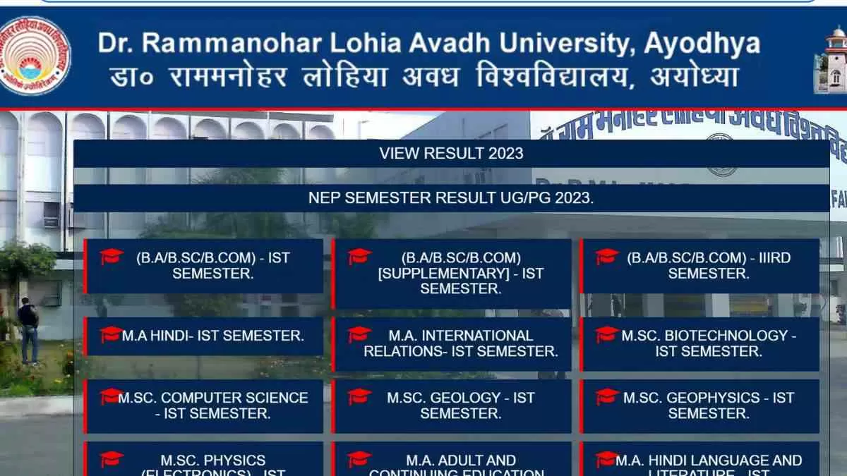 Ram Manohar Lohia Avadh University Result 2023: राम मनोहर लोहिया अवध यूनिवर्सिटी, अयोध्या ने विभिन्न पाठ्यक्रमों की परीक्षा का रिजल्ट जारी कर दिया है । जिन उम्मीदवारों ने अवध यूनिवर्सिटी के विभिन्न पाठ्यक्रम की परीक्षा 2023 में भाग लिया है, वे विश्वविद्यालय की आधिकारिक वेबसाइट results23.rmlauexams.in पर जा कर अपना रिजल्ट चेक कर सकते हैंI साथ ही उम्मीदवार नीचे दिए डायरेक्ट लिंक के जरिये भी अपना रिजल्ट चेक कर सकते हैंI इसके लिए अभ्यर्थियों को अपने लॉगिन क्रेडेंशियल का उपयोग करना होगा।