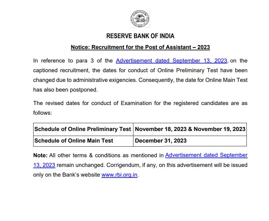 RBI Assistant Prelims And Mains Exam New Date 2023: आधिकारिक नोटिस