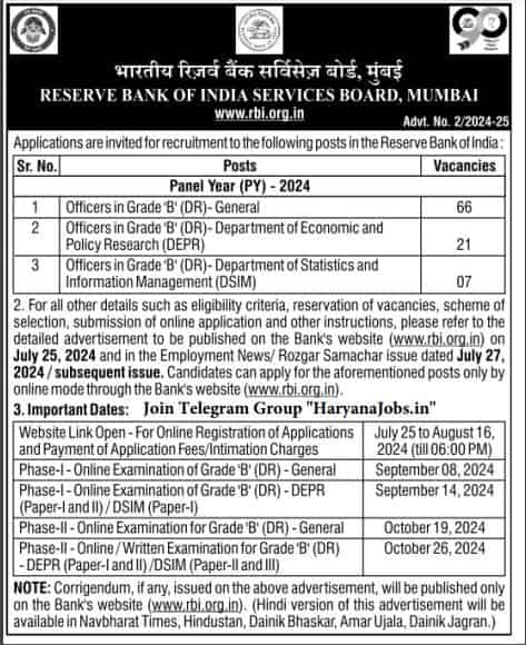RBI Grade B Recruitment 2024: The Reserve Bank of India is expected to release the notification for recruitment to the post of Officer Grade B (DR) under the General, Department of Economic and Policy Research and Department of Statistics and Information Management on 25 July. The candidates can submit their applications from 25 July to 16 August 2024.