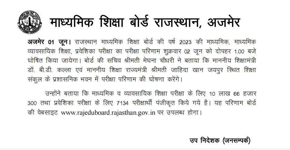 माध्यमिक शिक्षा बोर्ड राजस्थान की कक्षा दसवीं की परीक्षा का परिणाम कल दोपहर 1:00 बजे शिक्षा संकुल में जारी किया जाएगा।