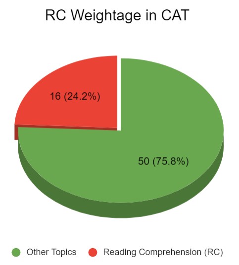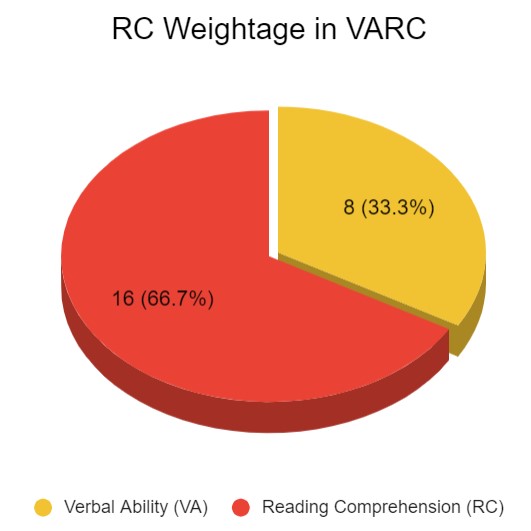 The Verbal Ability and Reading Comprehension section have 24 questions out of a total of 66 questions. These 24 questions are further divided into Verbal Ability and Reading Comprehension. In CAT 2023, Reading Comprehension questions account for around 16 questions out of 24 VARC questions. So RC holds 24% of the total marks and 67% weightage in the VARC section.