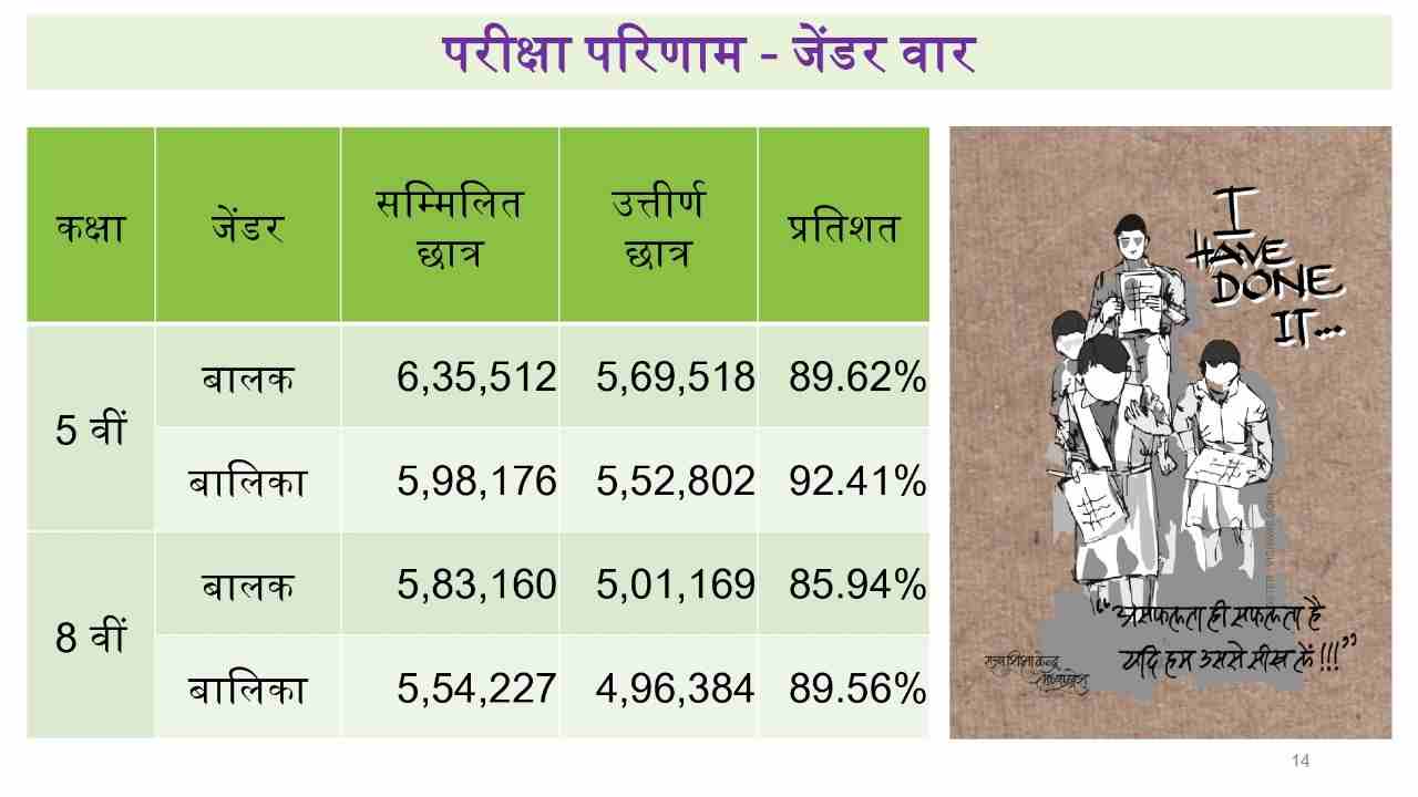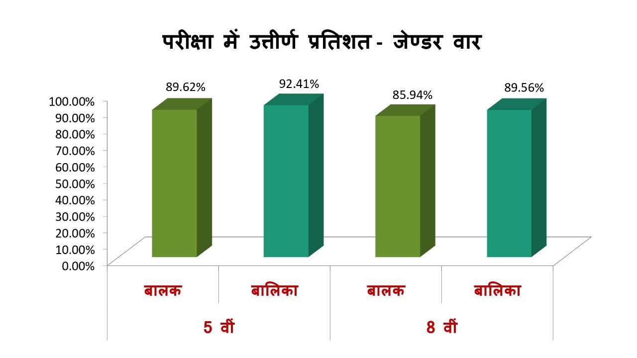 - कक्षा 5 के परीक्षा परिणामों में, लड़कियों ने सराहनीय प्रदर्शन किया, 6,48,856 छात्रों में से 92.41% उत्तीर्ण हुए। इनमें 5,98,176 लड़कियां शामिल हुईं और 5,52,802 पास हुईं। दूसरी ओर, लड़कों की उत्तीर्ण दर 89.62% थी, जिसमें 6,35,512 छात्रों में से 5,69,518 उत्तीर्ण हुए।