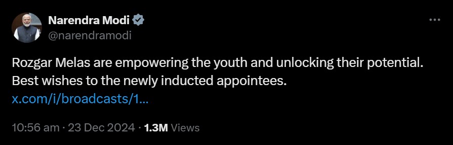 The Prime Minister's Office (PMO) emphasised that the Rozgar Mela reflects the government’s commitment to generating employment opportunities and empowering youth.