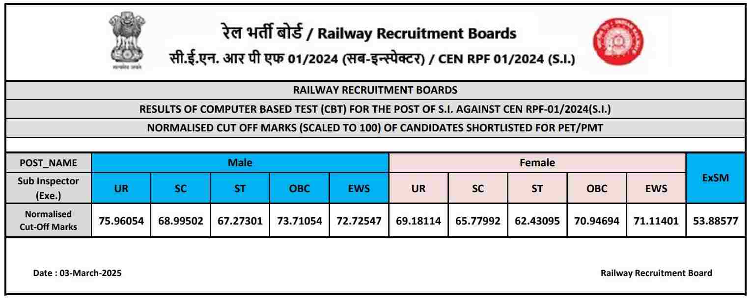 RPF SI Cut Off 2025: The Railway Recruitment Board (RRB) has officially released the cutoff marks for the Sub Inspector (SI) exam along with the RPF SI result. The cutoff marks have been released separately for male and female candidates across various categories.