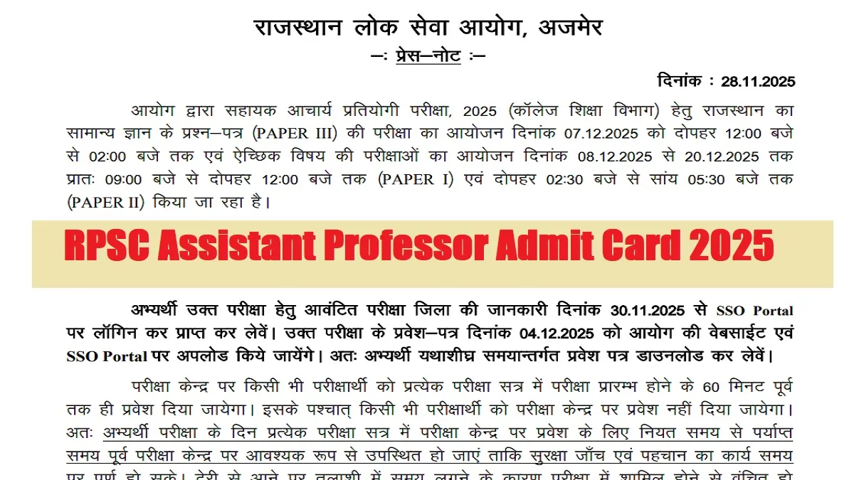 RPSC Assistant Professor City Intimation Slip 2025 : The Rajasthan Public Service Commission (RPSC) is all set to release the Exam District Information i.e. (City Slip Information) on November 30, for the posts of Asst. Prof. (College Education) Exam- 2025. The Commission will release the RPSC Assistant Professor Admit Card 2025 download link on December 04, 2025 on its official website. The written exam for the Assistant Professor posts is scheduled to be held from December 07 to 20, 2025 across the state. All such candidates who have to appear in the above exam can download their city slip and admit card as per the schedule from the official website -https://rpsc.rajasthan.gov.in.