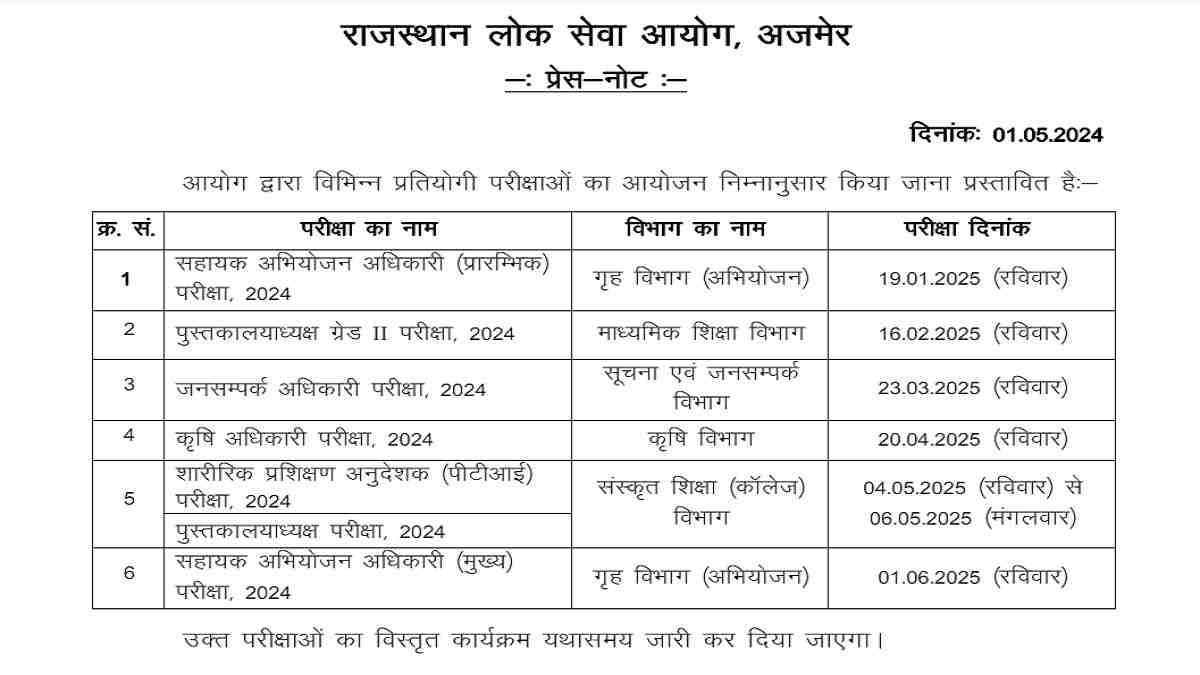 RPSC Exam Schedule 2024 Out: The Rajasthan Public Service Commission (RPSC) has released the exam schedule for various posts including Agriculture Officer, Asst. Prosecution Officer, PTI and Librarian and Public Relation Officer on its official website. The Commission will be conducting the written exam for these posts from January 2025 onwards. All those candidates who have applied successfully for these posts can download the detailed exam schedule from the official website -https://rpsc.rajasthan.gov.in.