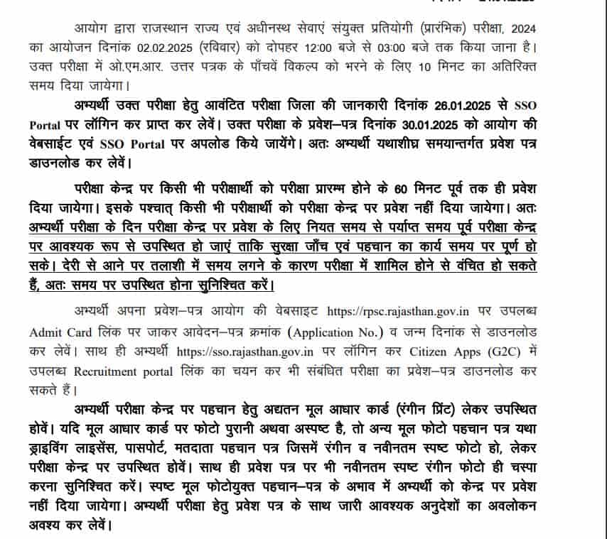 As the exam is scheduled to be held on 02 February. The admit card is released on 30 January. The exam will be conducted in a single shift i.e. from 11 AM to 2 PM. The candidates are required to login into sso.rajasthan.gov.in using their SSO ID and Password on that link to download the admit card.