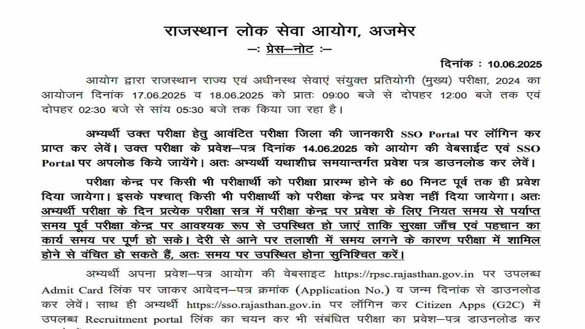 The RPSC will upload the mains hall ticket on June 14, 2025 on its official website. Candidates will have to use their login credentials to the link to download the hall ticket. However, you can download the hall ticket directly through the link given below, once it is uploaded-