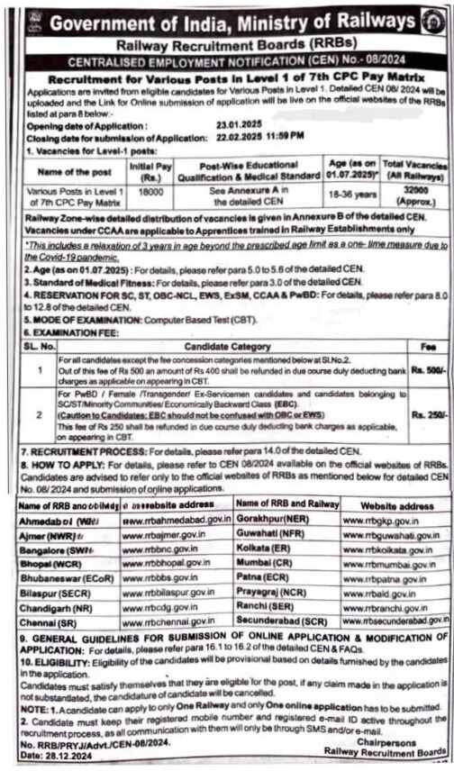 RRB has released a short notification (CEN 08/2024) for RRB Group D Level 1 Recruitment on December 23, 2024, through employment newspapers. As per the short notice, selected candidates will be placed on an initial pay scale of Rs 1800 and the required age limit will be 18-33 years.