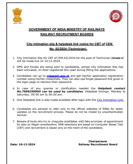 RRB Technician Exam City Intimation 2024 Notice PDFरेलवे भर्ती बोर्ड (RRB) द्वारा 19 दिसंबर से 29 दिसंबर, 2024 के बीच निर्धारित कंप्यूटर-आधारित टेस्ट (CBT) के लिए 10 दिसंबर, 2024 को RRB तकनीशियन परीक्षा शहर सूचना पर्ची 2024 जारी कर दिया गया है। इस पर्ची में परीक्षा शहर, तिथि, सत्र समय और रोल नंबर जैसे विवरण शामिल है। उम्मीदवार अपने पंजीकरण आईडी और पासवर्ड का उपयोग करके आरआरबी आधिकारिक वेबसाइट rrbapply.gov.in से अपने शहर की सूचना पर्ची डाउनलोड कर सकते हैं।