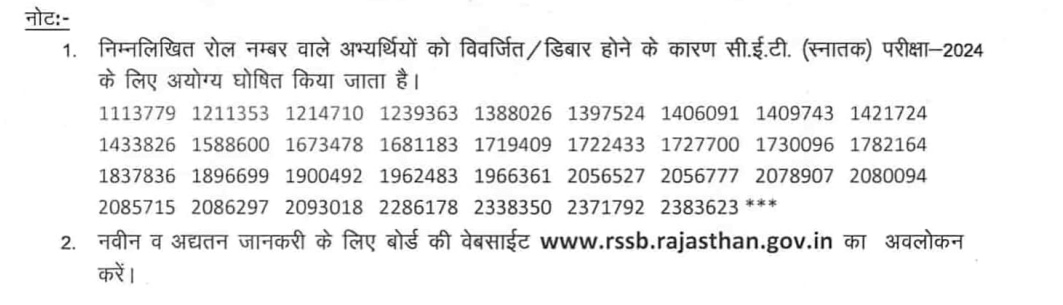 CET ग्रेजुएशन लेवल रिजल्ट 2025नीचे दिए रोल नम्बर वाले उम्मीदवारों को विवर्जित या डिबार होने के कारण सीईटी (स्नातक) परीक्षा-2024 के लिए अयोग्य करार दिया गया है।