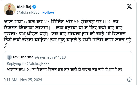 Alok Raj, Chairman of RSMSSB, had earlier announced on his X handle that the result will be released on November 25 at 6:27:56 pm. Refer to the official post below.