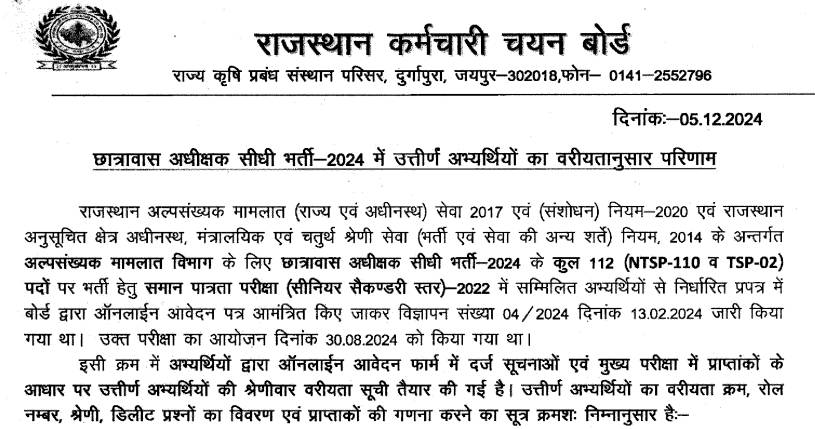 राजस्थान छात्रावास अधीक्षक रिजल्ट 2024 का अवलोकन