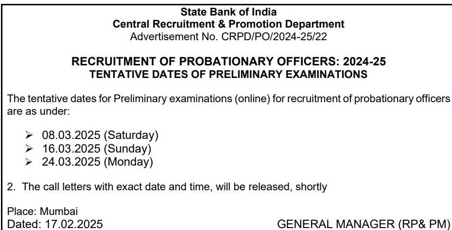 SBI PO Exam Dates 2025 OUT at sbi.co.in: The State Bank of India (SBI) has announced the exam dates for the post of Probationary Officer (PO) on its official website i.e. sbi.co.in. The exam is scheduled to be held on 08, 16 and 24 March. Candidates who have applied for the PO Exam are advised to prepare accordingly.